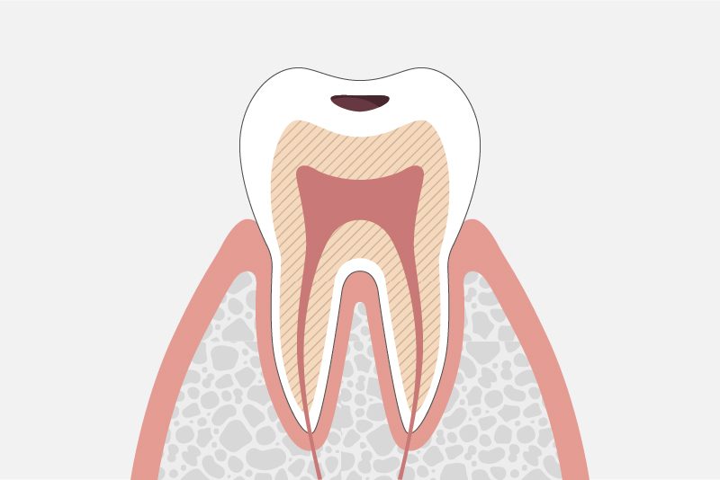 細菌感染が象牙質の内側の歯髄(歯の内部の神経)にまで達した状態の虫歯です。歯髄に細菌が進入し、ズキズキと激痛を伴う場合があります。